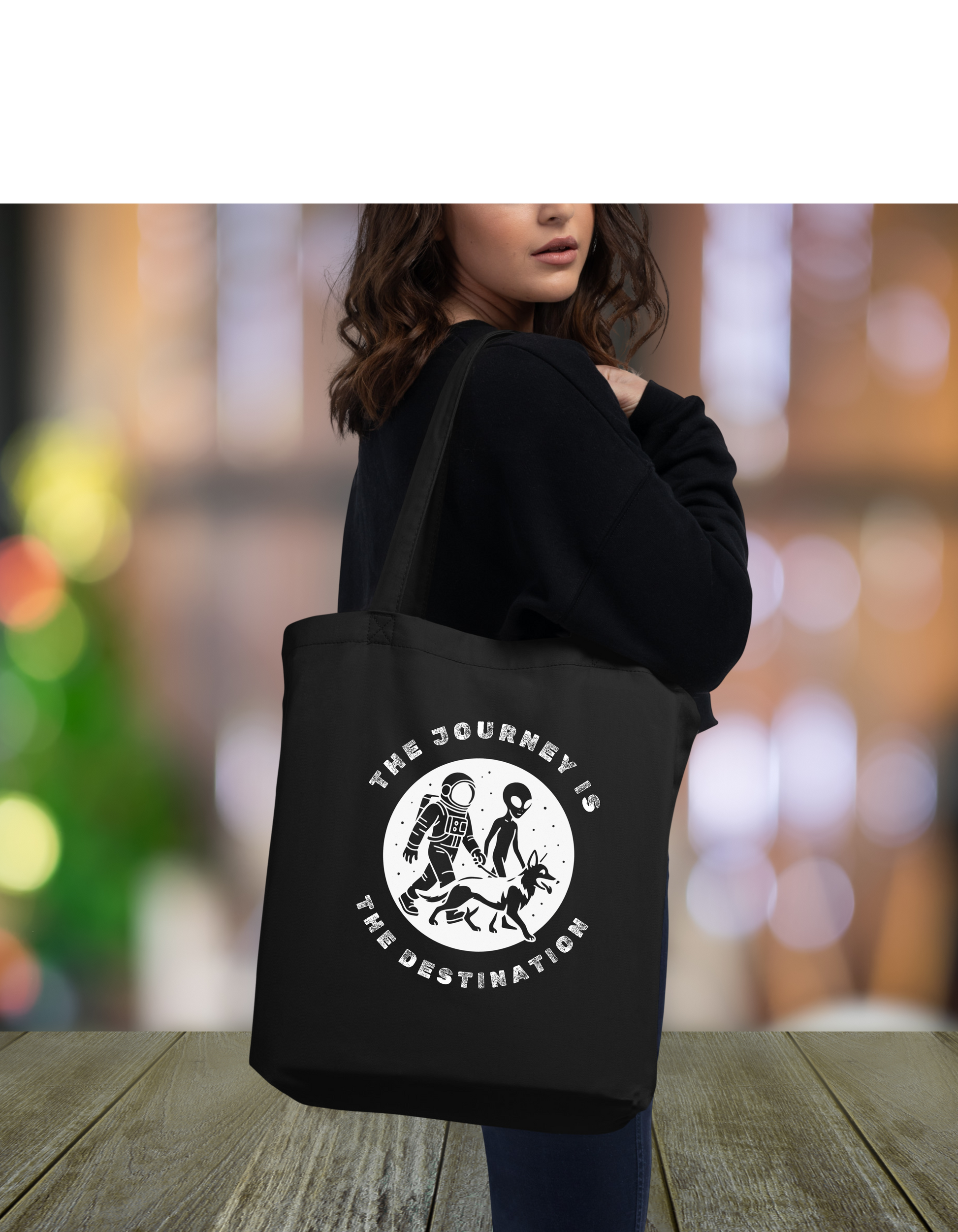 Say goodbye to plastic and hello to purposeful style with this black organic cotton tote bag. Perfect for dog lovers, space dreamers, and anyone who knows the journey matters most.